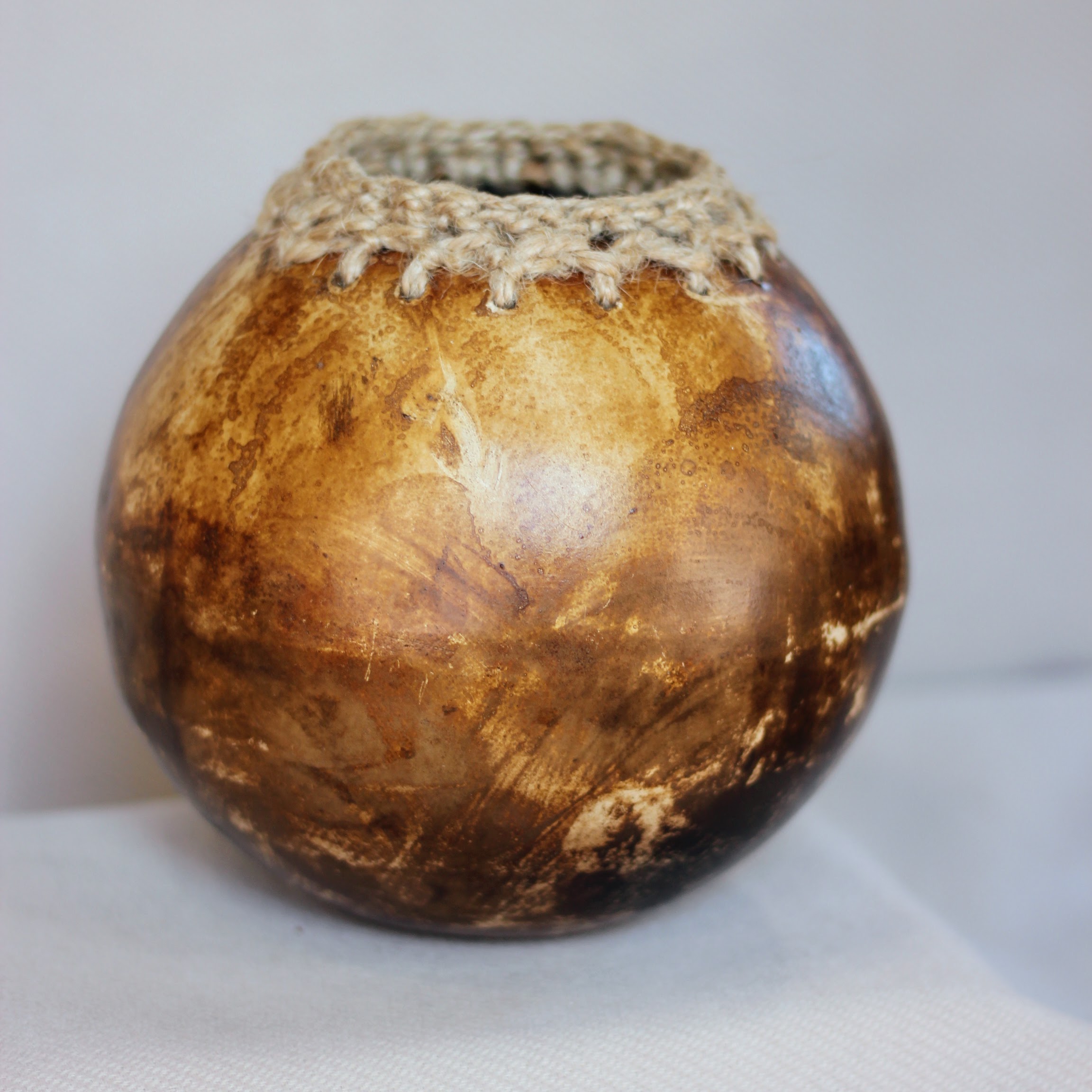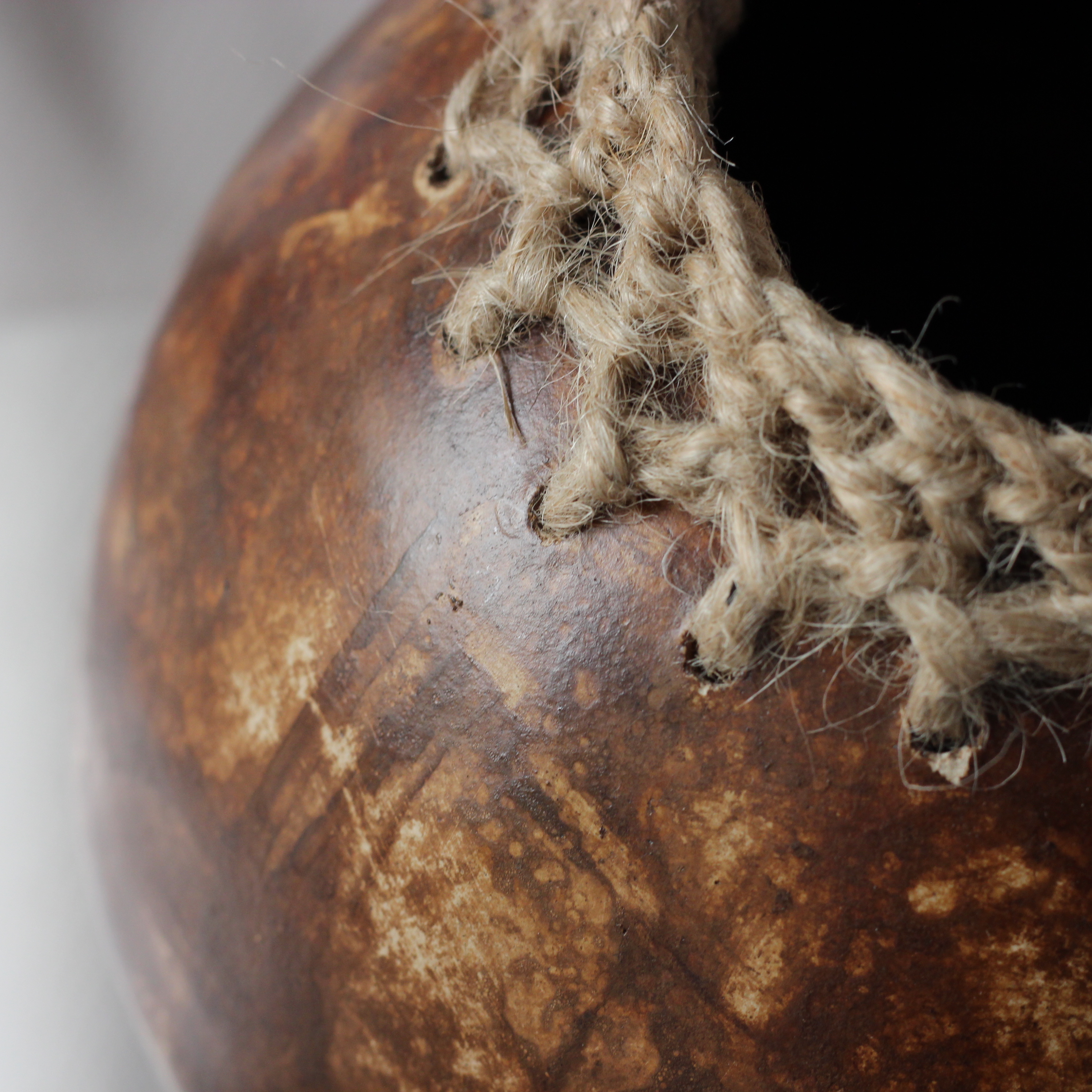 Ręcznie lepione naczynie artystyczne „Pleciony Brzeg II”, inspirowane koreańskimi moon jarami. Małe, ale pełne uroku – o idealnie gładkiej, ziemistej powierzchni w ciepłych odcieniach brązu. Wykończone jutowym splotem wykonanym szydełkiem, łączy w sobie glinę, ogień i włókno w duchu dawnych rzemiosł.