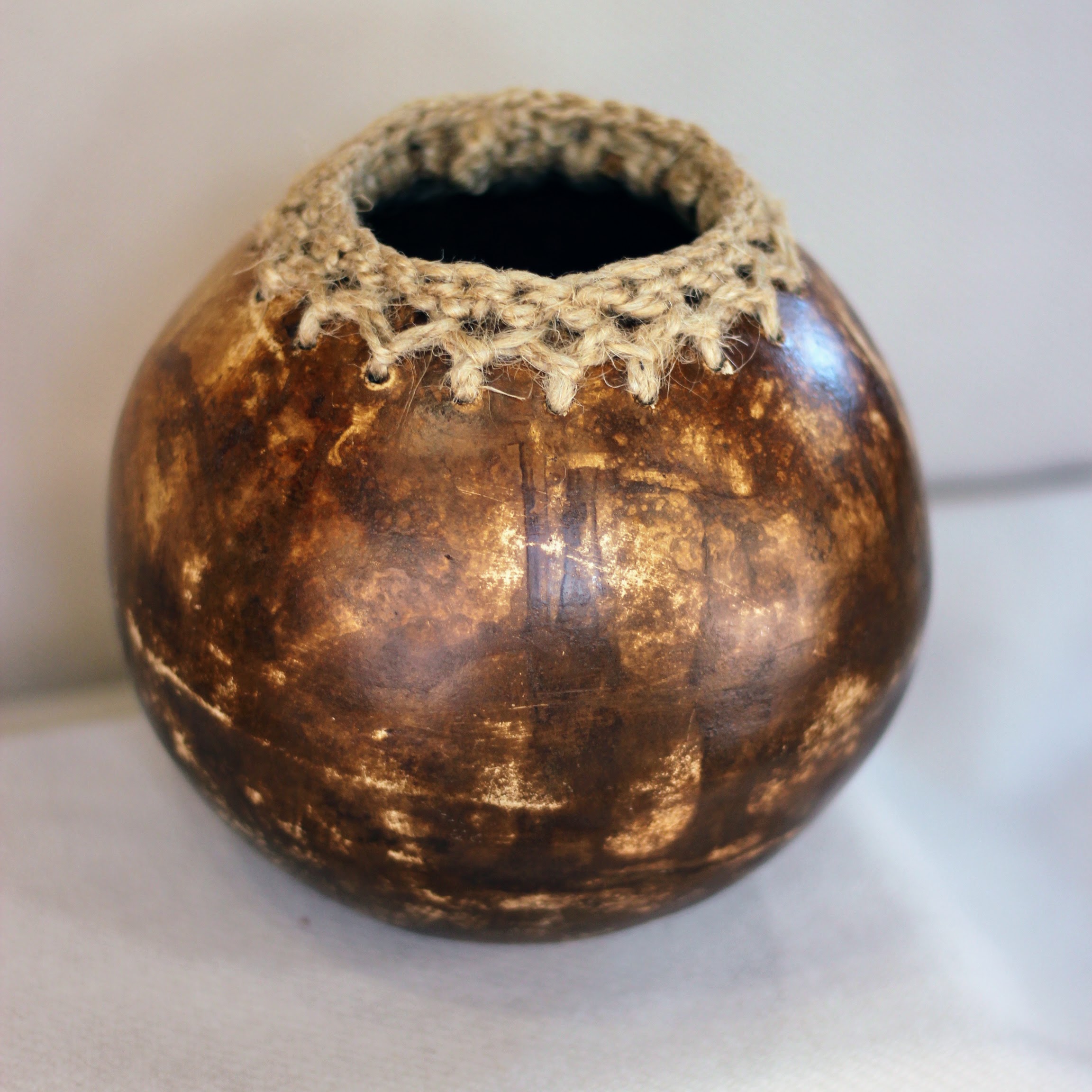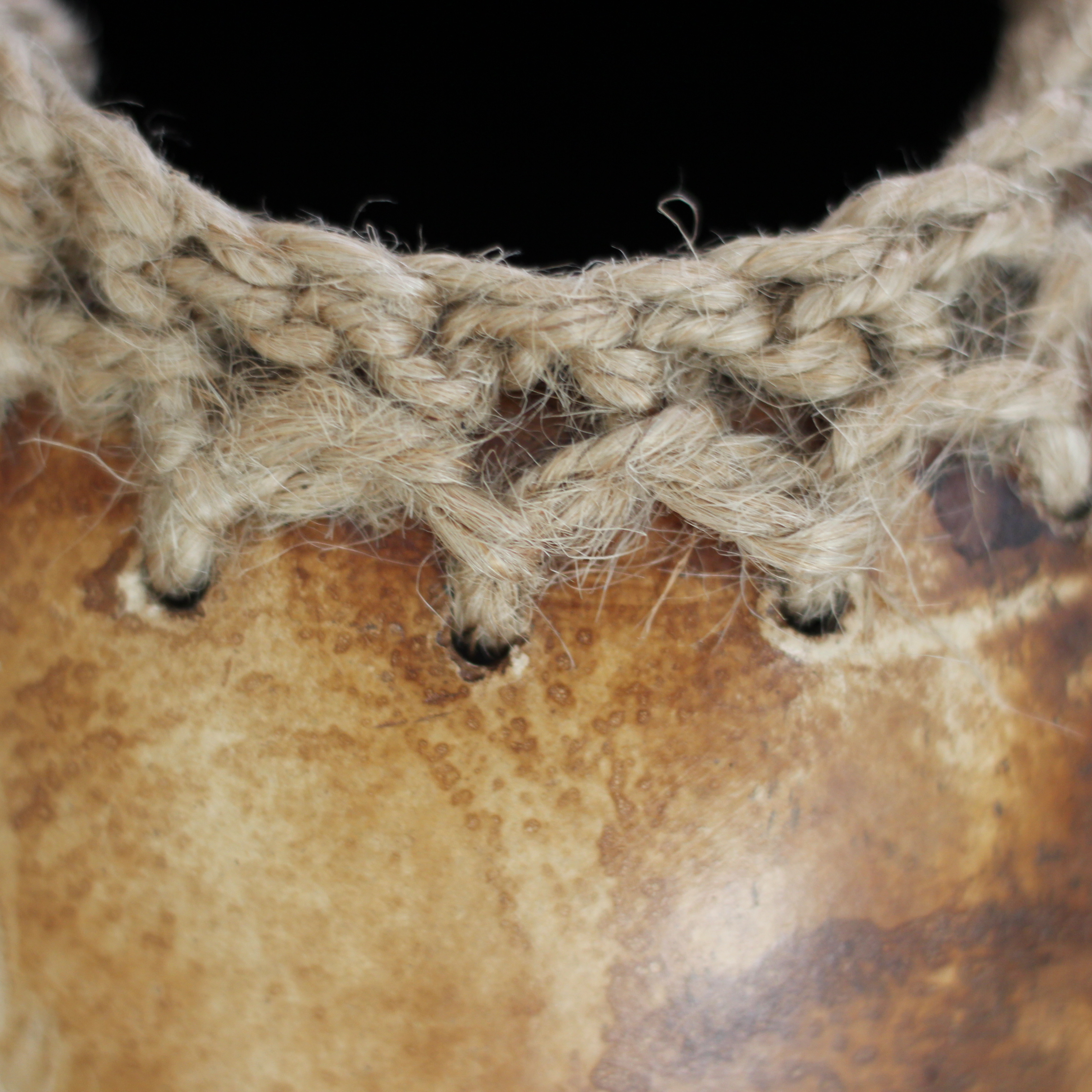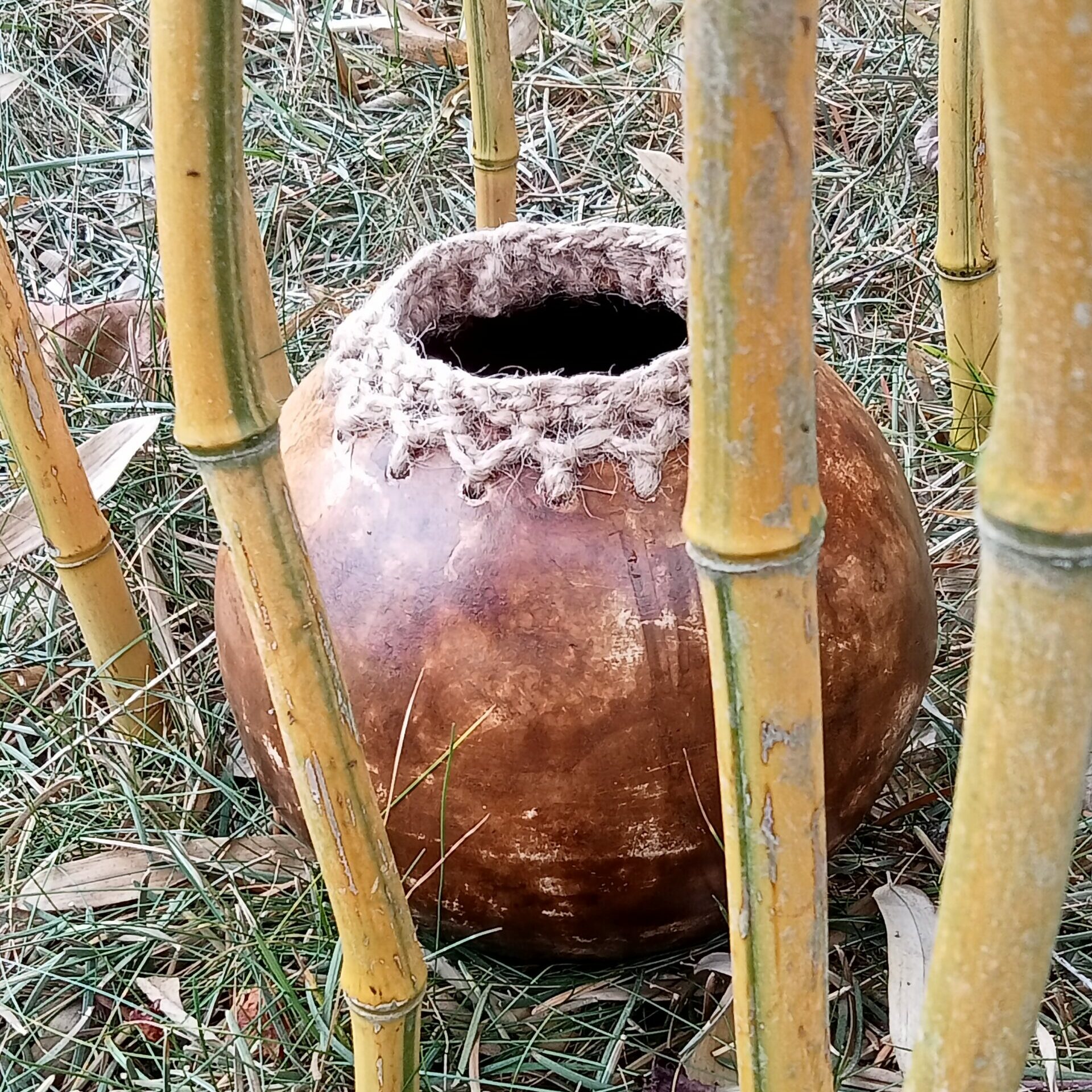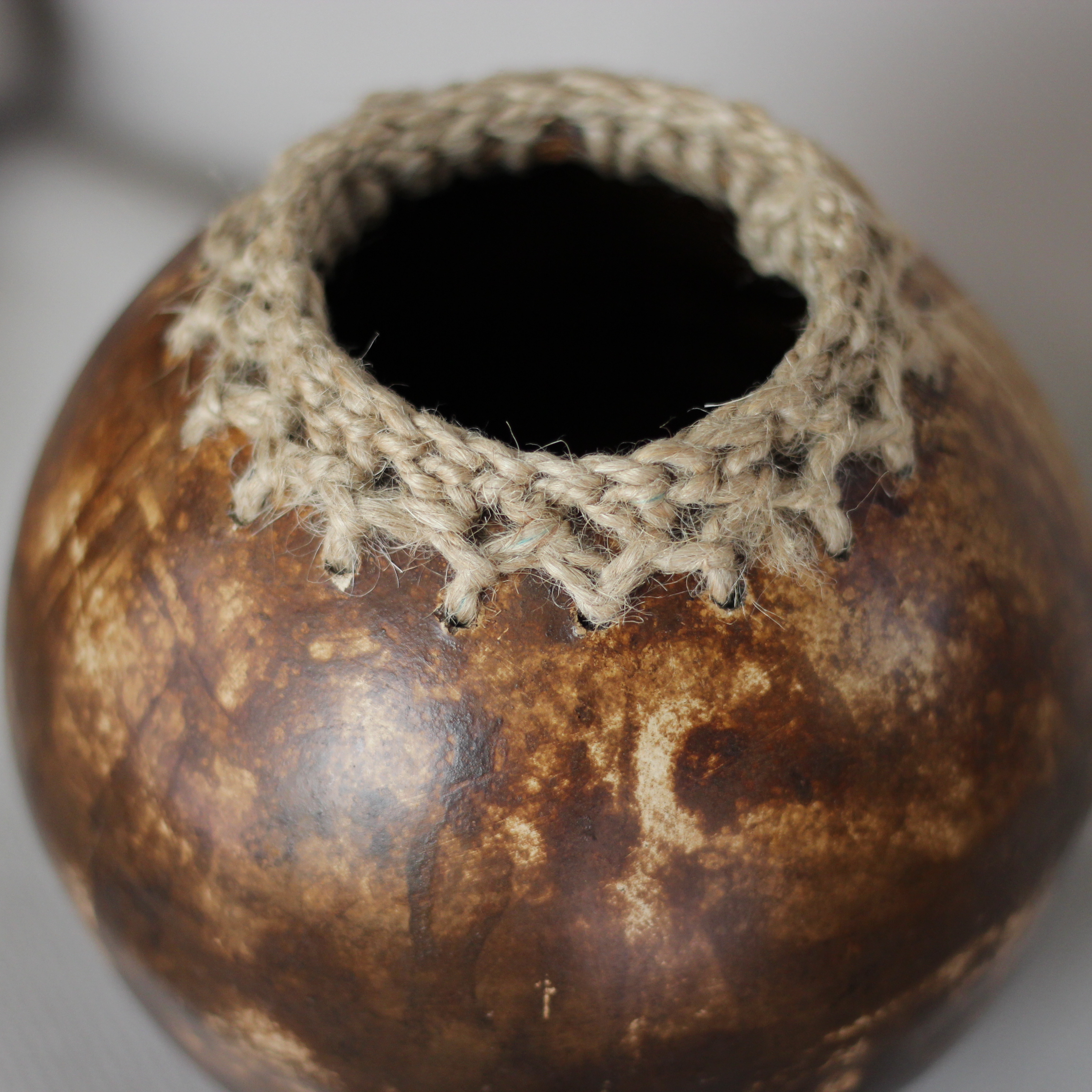 Na koniec chciałam otulić to naczynie czymś miękkim, jak gest troski. Sięgnęłam po naturalny sznurek jutowy i szydełkiem, powoli, oczko po oczku, oplotłam rant. Ten splot to coś więcej niż dekoracja – to rodzaj symbolicznej ochrony, coś w rodzaju korony albo amuletu. Włókno i glina – dwa światy, które połączyły się w jednym rytuale.