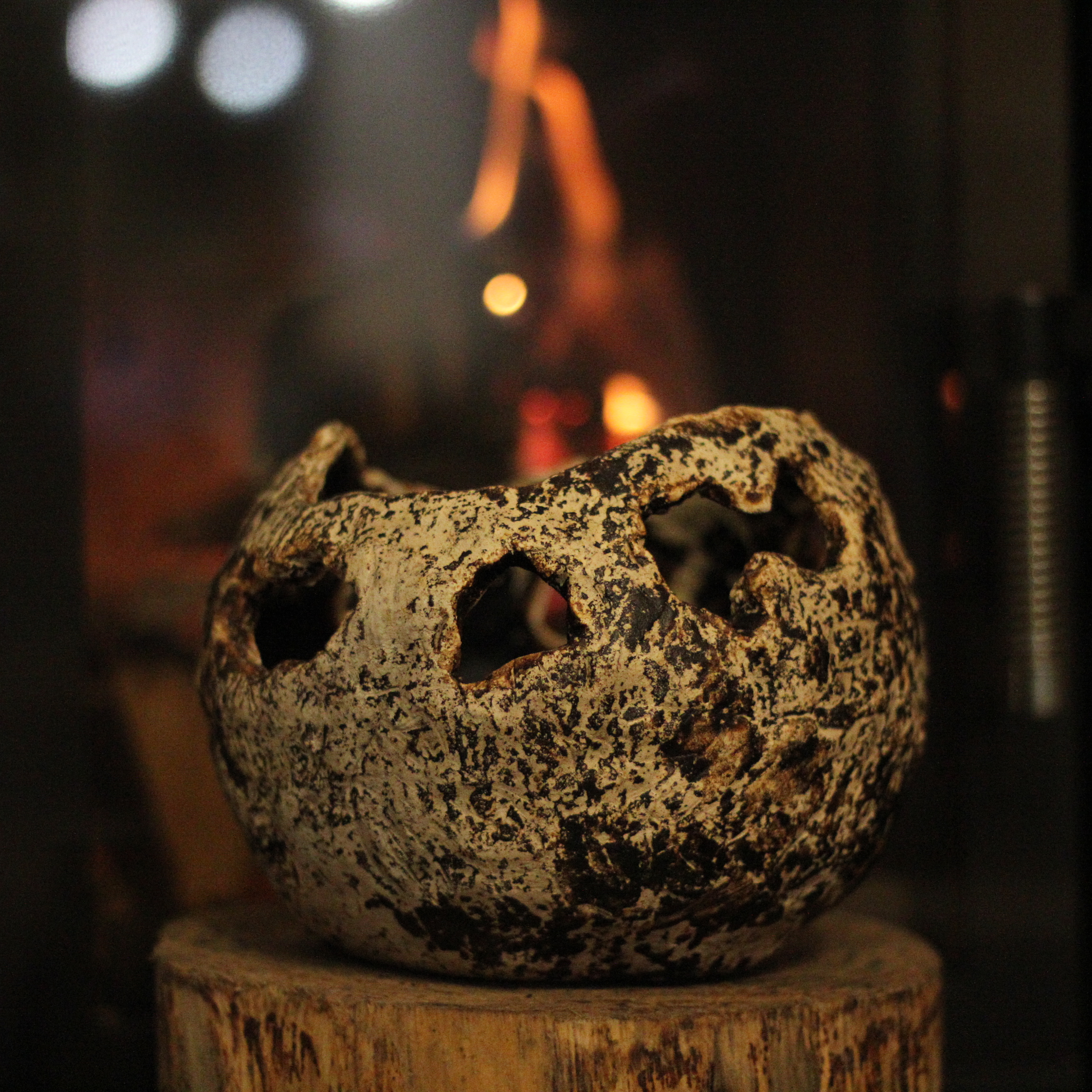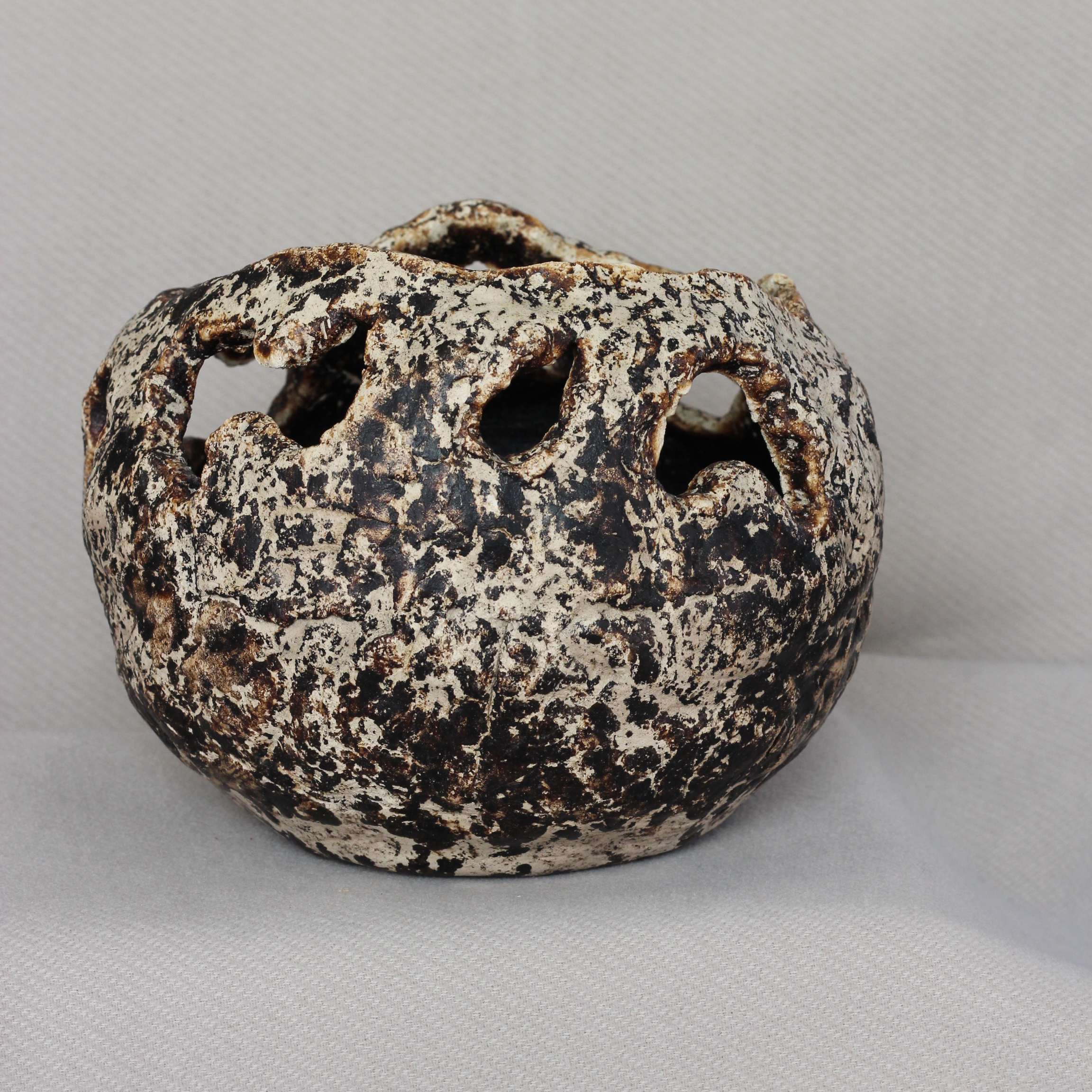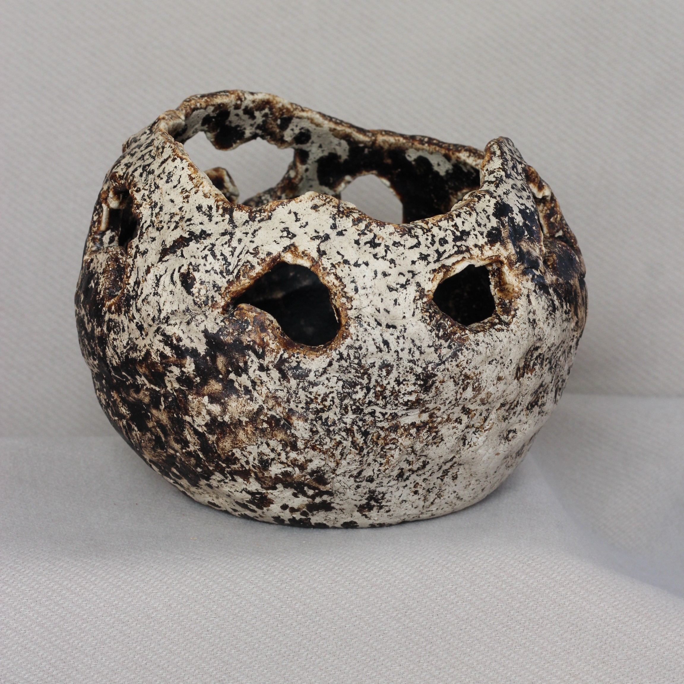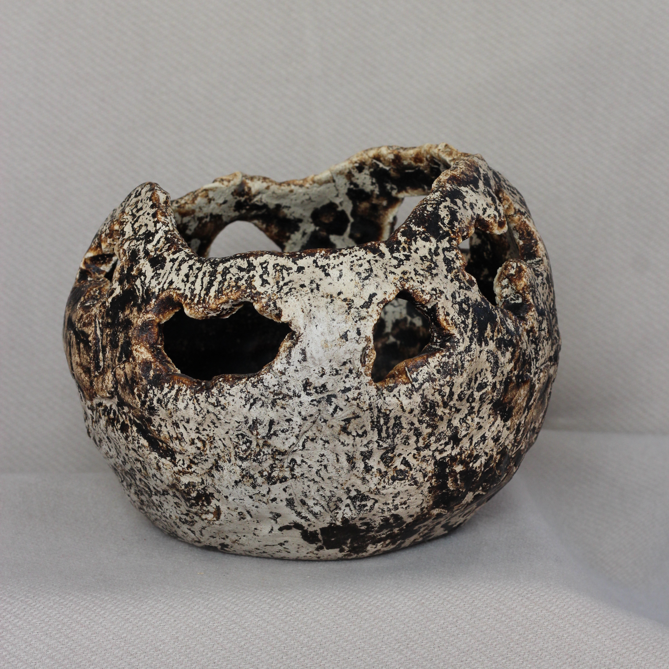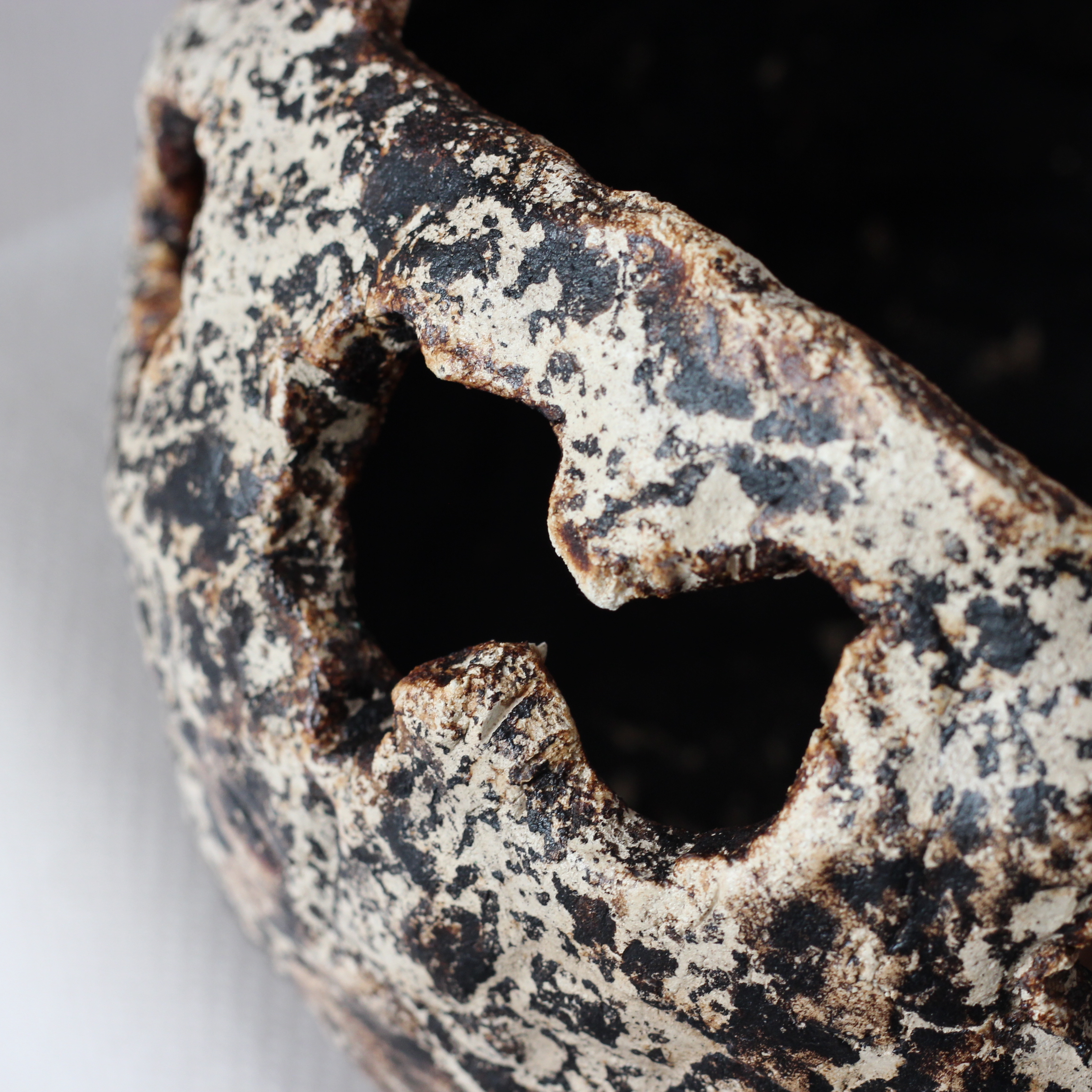 Podczas wypału w technice obwary glina zetknęła się z mieszanką wody, mąki i dymu. Reakcja była gwałtowna, ale piękna — na powierzchni powstał rysunek popiołu, skały, ślad po żywiole. Czerń przenika w szarość i biel, jak po burzy, gdy dym jeszcze unosi się nad ziemią.